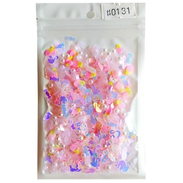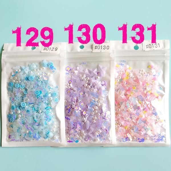 艶消しで淡い半透明なパステルカラーのスパンコールを中心に、模造パールとトッピングシュガーも少し入っています。