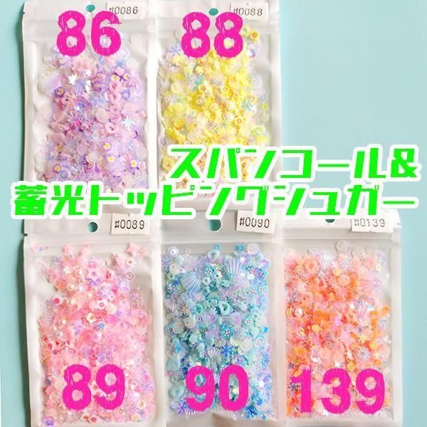 蓄光タイプのトッピングシュガーといろいろなタイプのスパンコールで、明るいところでは透け感のある淡いカラー、暗闇では光る2つの顔を持つミックスになっています。