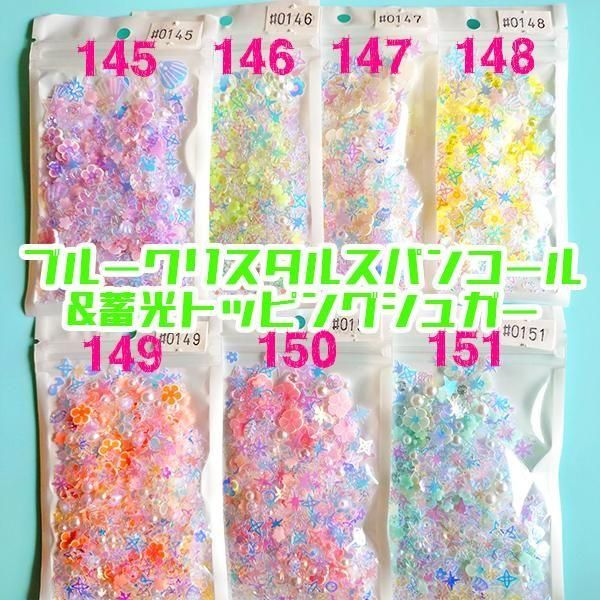 蓄光タイプのトッピングシュガーとブルーに反射する透明なスパンコール、模造パール、クリスタルパーツなどキラキラ感溢れる異素材ミックスタイプのスパンコールです。