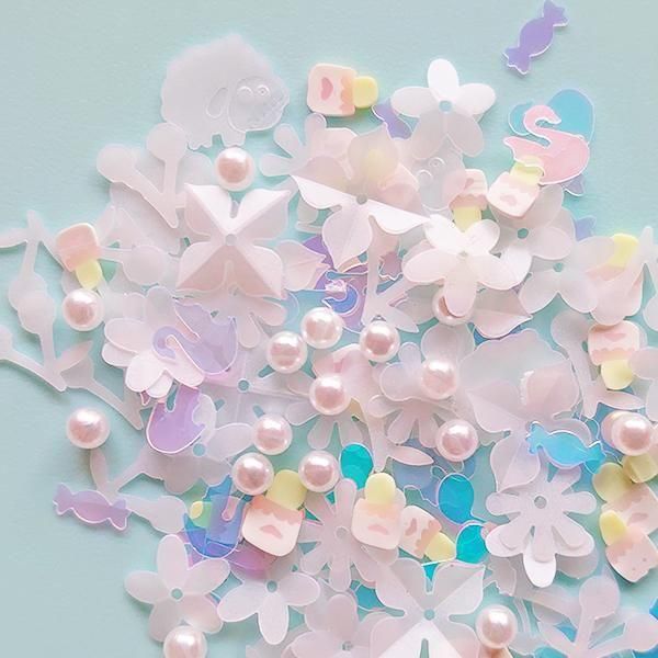 艶消しで淡い半透明なパステルカラーのスパンコールを中心に、模造パールとトッピングシュガーも少し入っています。