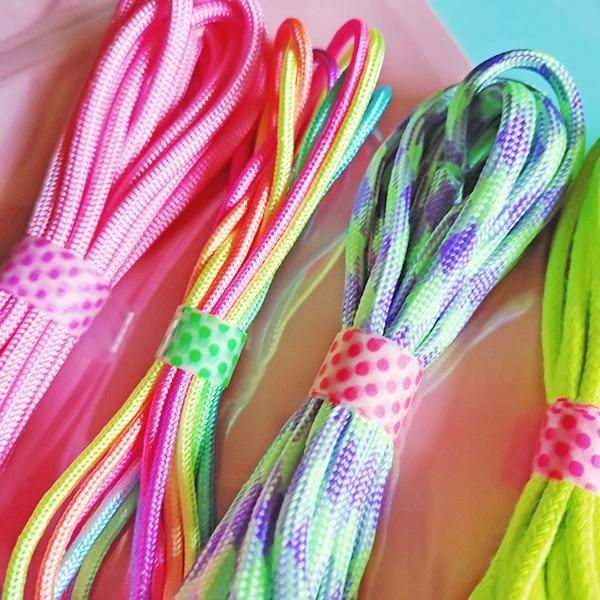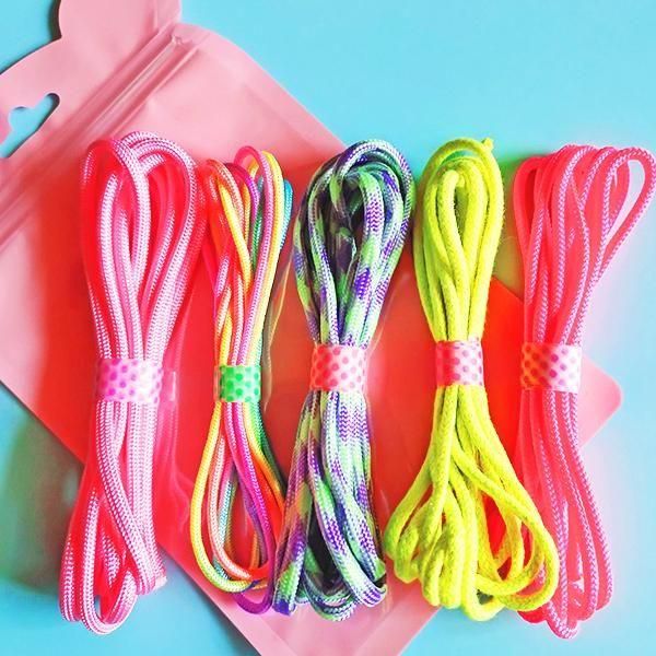 5色のコードとカラフルな金具、大きい穴のビーズがセットになっています。 ---------------------- 【内容】 ■パラコード・マクラメコード 5種類×各2メートル=合計10メートル ※コードは伸縮するため、多少誤差がある場合がございます ■金具 3個 ■ビーズ 5個 ※金具とビーズのカラーはランダムです キットではないので、作り方の説明書等は入っていません。 「パラコード」や「マクラメ」の編み方を検索すると沢山出てきますので、色んなオリジナル作品作りにお使いください。 ---------------------- 今後も発売する予定ではいますが、毎回組み合わせは変わる予定です。 no.003〜no.005のコード計15種類は、すべて違うものになっています。 ※同じ種類もありますが、太さが異なります。 いろいろな太さや素材、質感を組み合わせるとメリハリが出来て楽しい感じになるので、2mm〜4mm、硬めのものと少し柔らかいものなど、そして1種類はナイロン芯は入っていない派手色(今回はどちらも蛍光カラー)のマクラメコードが入っています。 コードの切り口はライター等の火であぶることによりほつれ止めできます。 マクラメコードにはナイロン芯は入っていませんが、糸自体にポリエステルが含まれているため、同様に火であぶることでほつれ止めできます。 |