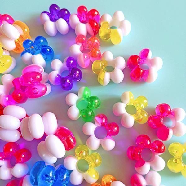 クリアカラー×ホワイトの2色が組み合わされたカラフルな「クリアカラー×ホワイト 2トーンポニービーズ」が大きいお花型になったようなビーズ。 サイズ:直径約17mm×高さ11mm 穴のサイズ:約6mm ランダムカラー7個入り 最近チェックした商品